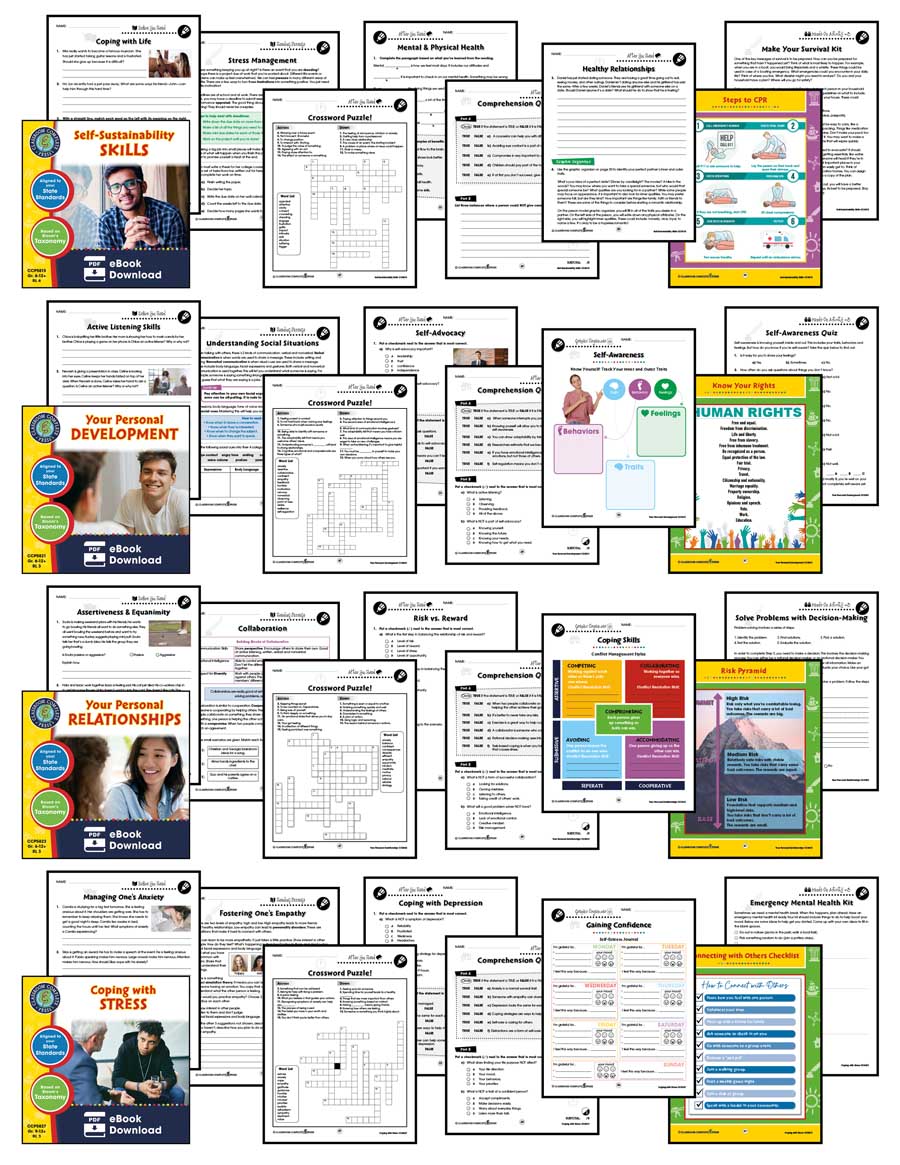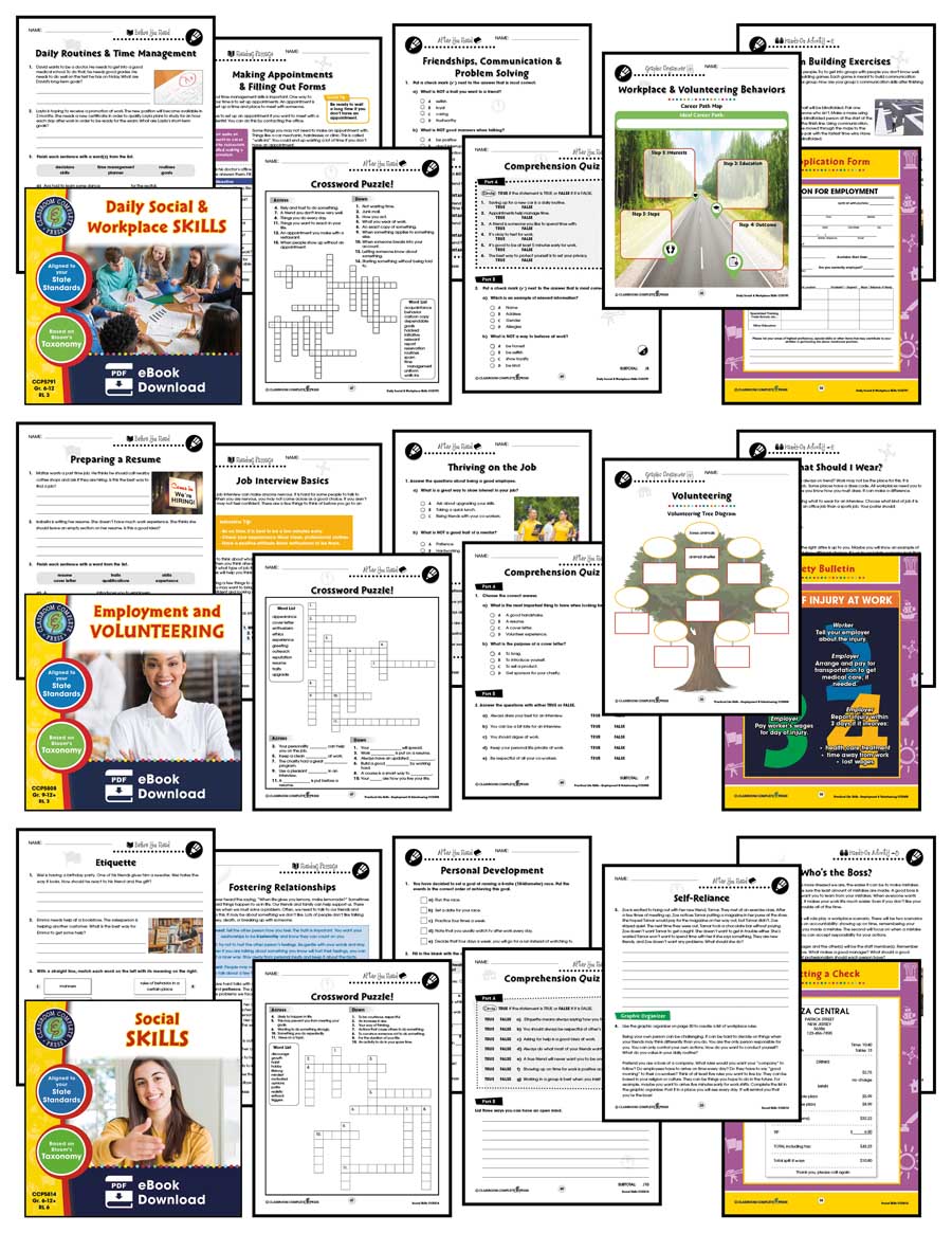 In this State Standards-aligned Life Skills Set, we combine 7 ready-made lesson plans on Communication & Interpersonal Skills. Students learn how to communicate effectively with others, including listening skills, teamwork, collaboration, and empathy. Each resource is comprised of reading passages, graphic organizers, real-world activities, crossword, word search and comprehension quiz. Our resource combines real-life concepts and ideas with simplified vocabulary for easy comprehension for high school students and adults. All of our content is reproducible and aligned to your State Standards and are written to Bloom's Taxonomy.