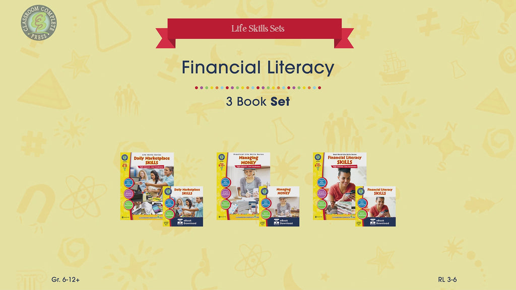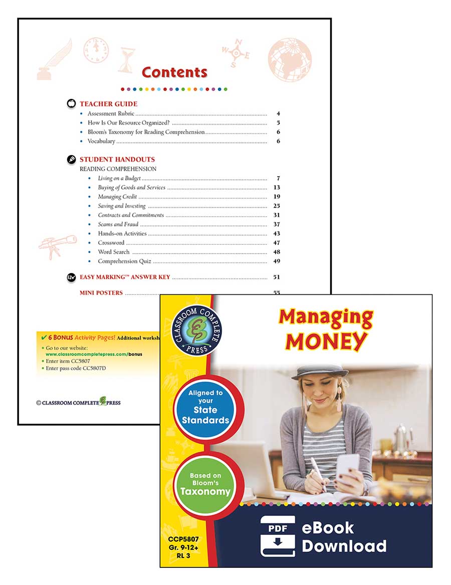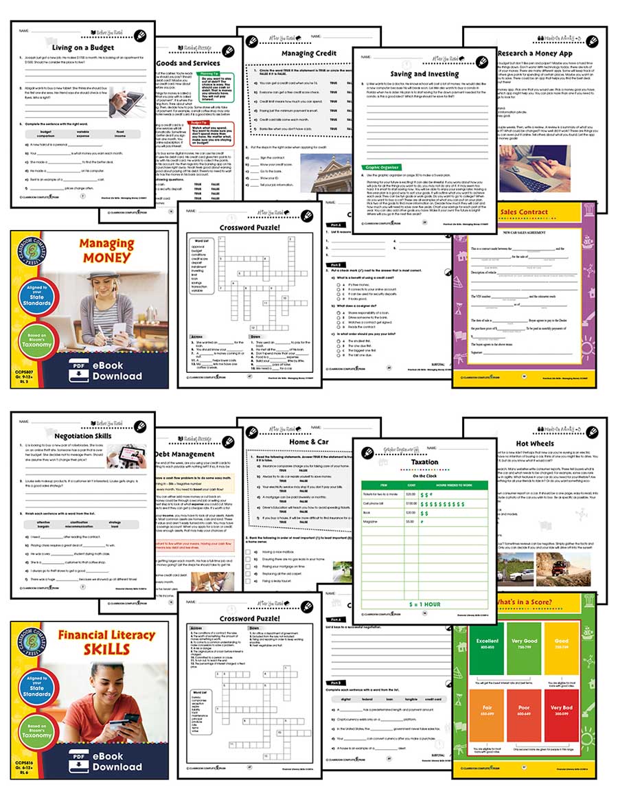 In this State Standards-aligned Life Skills Set, we combine 3 ready-made lesson plans on Financial Literacy Skills. Students learn how to be smart with their money, how to spend it and how to save it. Each resource is comprised of reading passages, graphic organizers, real-world activities, crossword, word search and comprehension quiz. Our resource combines real-life concepts and ideas with simplified vocabulary for easy comprehension for high school students and adults. All of our content is reproducible and aligned to your State Standards and are written to Bloom's Taxonomy.
