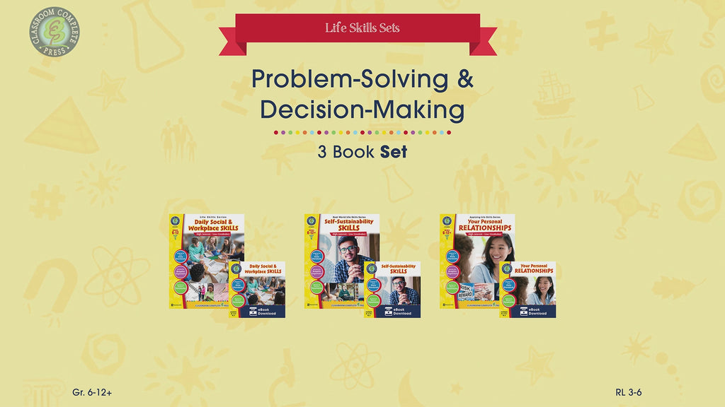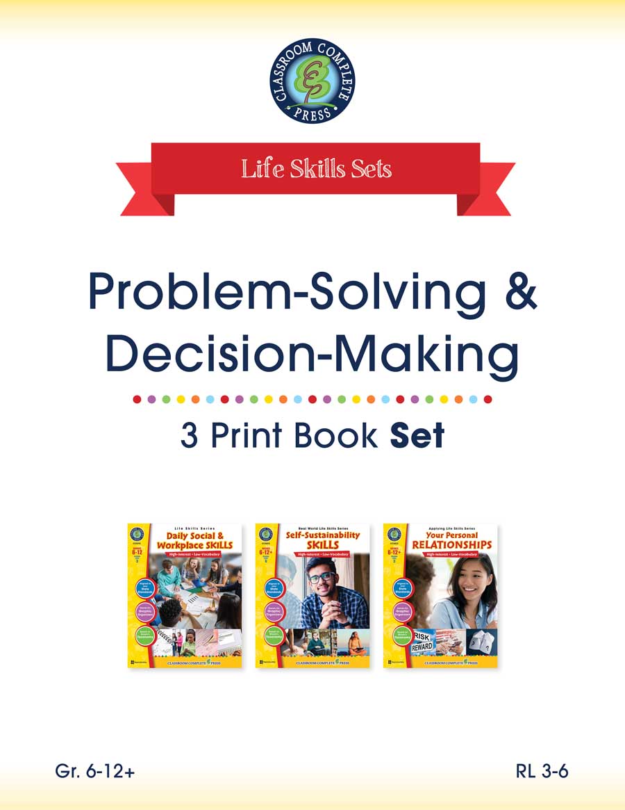 In this State Standards-aligned Life Skills Set, we combine 3 ready-made lesson plans on Problem-Solving & Decision-Making Skills. Students learn the process of identifying a problem, analyzing it, finding a solution, and making choices. Each resource is comprised of reading passages, graphic organizers, real-world activities, crossword, word search and comprehension quiz. Our resource combines real-life concepts and ideas with simplified vocabulary for easy comprehension for high school students and adults. All of our content is reproducible and aligned to your State Standards and are written to Bloom's Taxonomy.