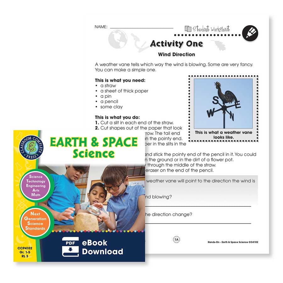 Inspire your students to gain a deep understanding of our planet earth and beyond with our Hands-On Earth & Space Science resource for grades 1-5. Combining Science, Technology, Engineering, Art, and Math, this resource aligns to the STEAM initiatives and Next Generation Science Standards. Make your own weather forecast as a group. Find out how much rain has fallen by building your own rain gauge. Get a glimpse at how wind works by creating your own sand dunes. Tell a story by drawing your own rock layer. Get into groups to make your own solar cell, windmill, or water wheel. Track the movement of the Moon with your own Lunar Calendar. Each concept is paired with reproducible hands-on experiments and comprehension activities to ensure your students are engaged and fully understand the concepts. Reading passages, graphic organizers, before you read and assessment activities are included.